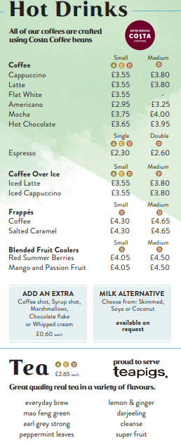 Here’s the menu for the Costa Coffee shop on P&O Cruises’ ships. You can also get Costa speciality coffees in many of the other bars and lounges on your ship.